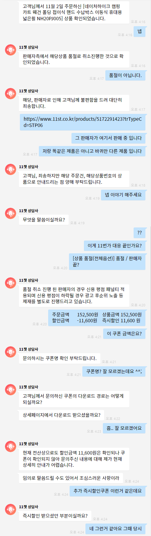 진짜 어이가 없어서 11번가 상담을 했습니다