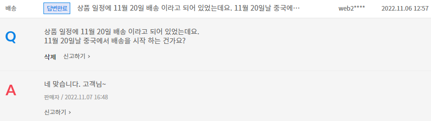 그때만 해도 판매자는 11월 20일에 배송이 가능하다고 사이트에 있어서 믿고 구매를 했습니다.