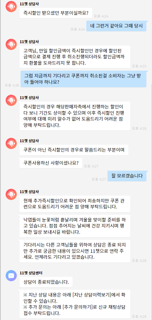 지금까지 채팅 상담하면서 먼저 나가는 상담사는 처음 보네요 ㅎㅎ소비자 보호는 1도 없는 11번가.. 황당 하네요.